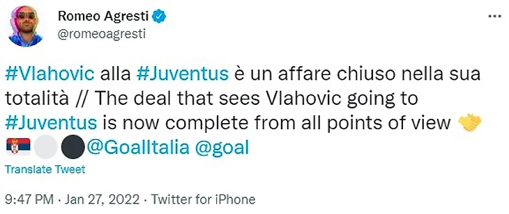 Наконец-то пришло подтверждение, которого ждали все болельщики «Ювентуса»: договоренность о переходе Душана Влаховича достигнута, сербский центрфорвард находится в одном шаге от трансфера в «Ювентус», это подтверждает инсайдер Ромео Агрести.