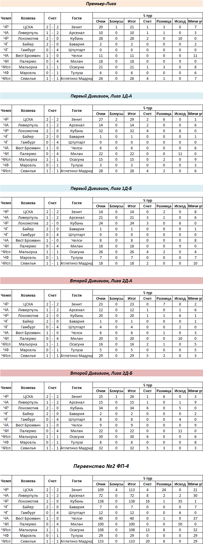 5-ый тур вместил в себя как результативные, так и не совсем удачные игры: половина матчей позволила суммарно набрать участникам 100 и более очков, а матчи Байер - Бавария и Гамбург - Штутгарт вышли из ряда вон по части результативности. Что интересно, Лига 2Д-Б сумела подарить 4 из всего 6-ти угаданных исходов в предполагаемой участниками победе Штутгарта.