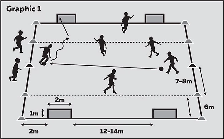 С этими небольшими изменениями игра претерпевает революцию. Ее легче понять, она всеохватна и весела. Она дает детям много касаний и больше возможностей для ситуаций 1-в-1 или 2-в-1, а также заставляет их больше думать. При отсутствии офсайдов, угловых или вбрасываний игроки вынуждены решать, идти ли им с мячом на дриблинге или пасовать мяч обратно в розыгрыш. Это также дает детям в этом возрасте больше шансов делать то, что они хотят делать больше всего — забивать голы. И, возможно, самое приятное то, что как только дается первоначальное объяснение, тренер практически отстраняется от ситуации, потому что сама игра становится учителем. Это эффективно возвращает детям четырехфазную модель восприятия, понимания, принятия решений и исполнения. В этой модели каждый игрок получает возможность пройти каждую фазу, так что к 15 годам он сможет войти в формат 11-на-11 с гораздо более широким спектром навыков.