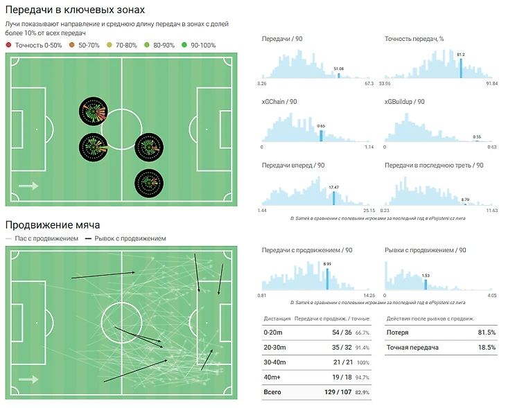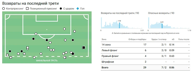 В этом сезоне Самек играет в основе, получает много времени на поле и демонстрирует просто фантастические цифры для 17-летнего парня. На его счету 3+3 в 13 матчах чемпионата и ещё один ассист в кубке страны. Но результативные действия — не самое важное в игре опорного/центрального полузащитника. Он выделяется во многих аспектах.