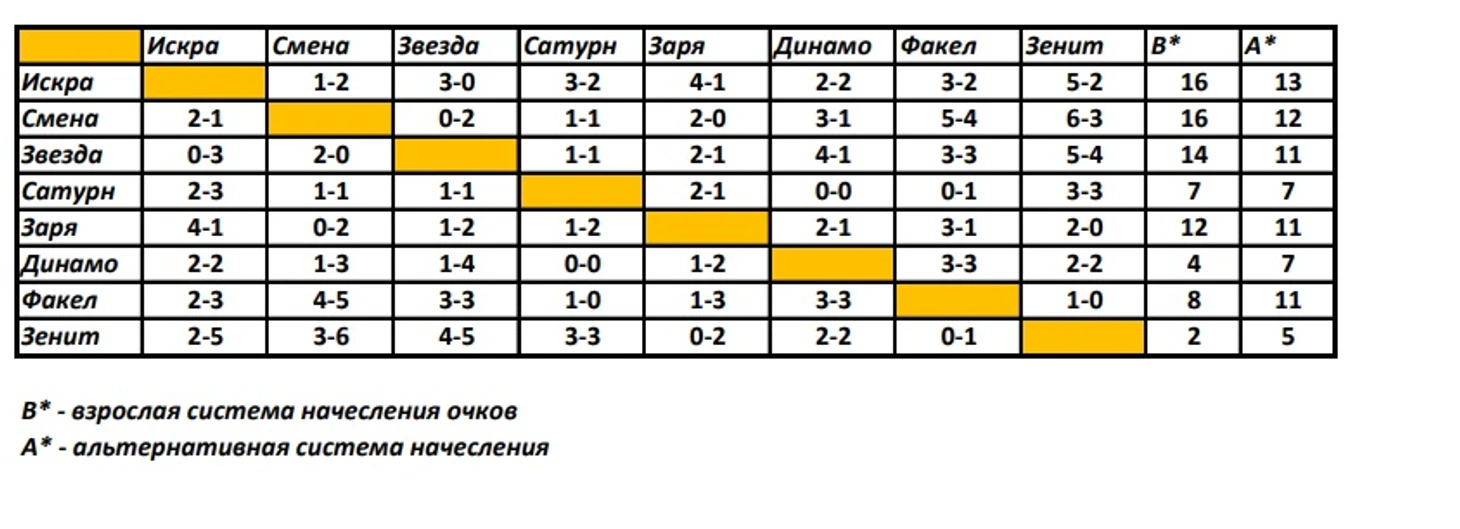 «Смена» выиграла со счетом 5-0 у команды «Факел». Пока все очевидно: в турнирной таблице команда «Смена» заслуженно получила 3 очка за «сухую» победу; команда «Факел», к сожалению, не получила очков, так как дети из этой команды не смогли отличиться результативными действиями.