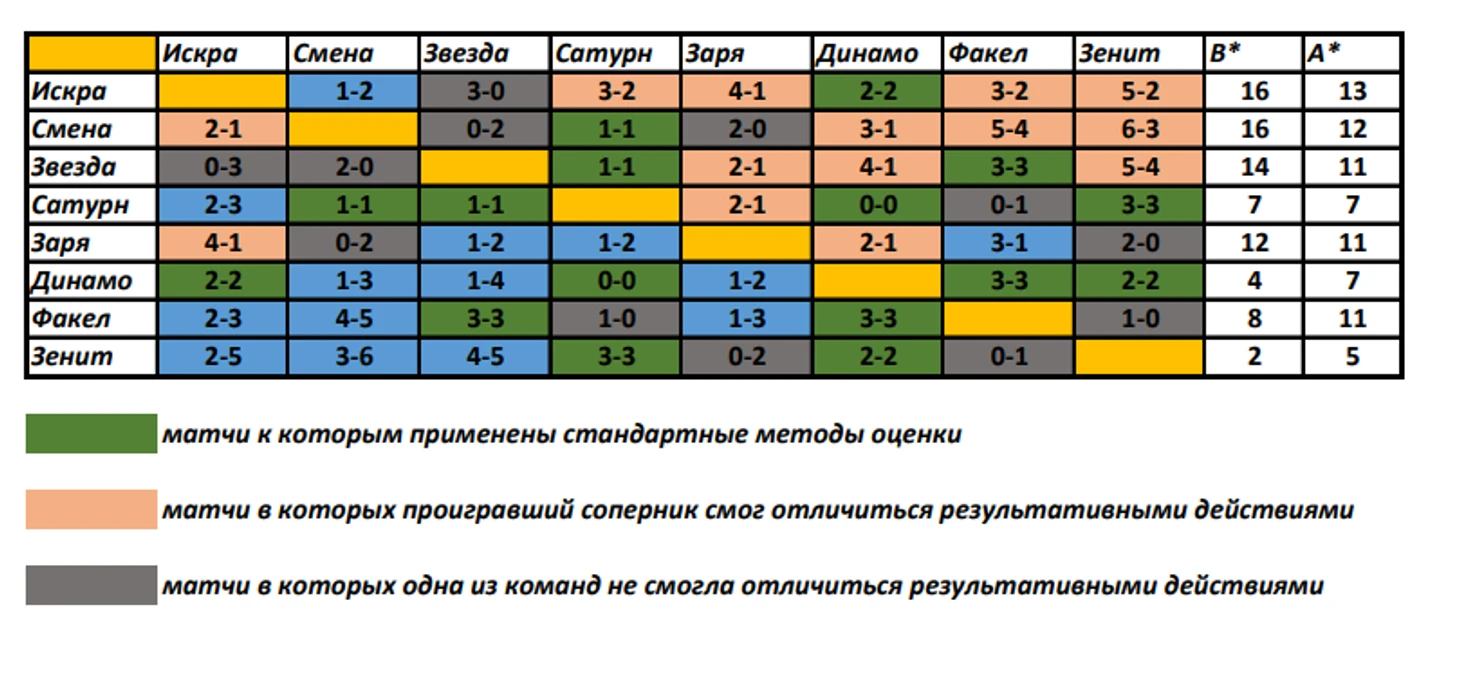 Обратите внимание: кардинально это не влияет на распределение призовых мест. Но из плюсов, которые на данном примере подметил бы я для вас, - это очень плотная таблица при альтернативном подсчете: разница между первым и восьмым местом в данном примере - всего 8 очков, количество очков, «собранных» командой, с самого низа увеличивается не за счет побед или ничейных результатов, а за счет активных атакующих действий. Для более слабых школ это тоже маленькие, но вполне достижимые цели. В играх с заведомо сильным соперником они могут ставить себе более реальные цели. Увеличивается и качество игры команд из верхней части таблицы: мало становиться просто выиграть. Играя в атаку, необходимо еще постараться хорошо сыграть и в обороне, чтобы "собрать" как можно больше очков.