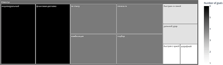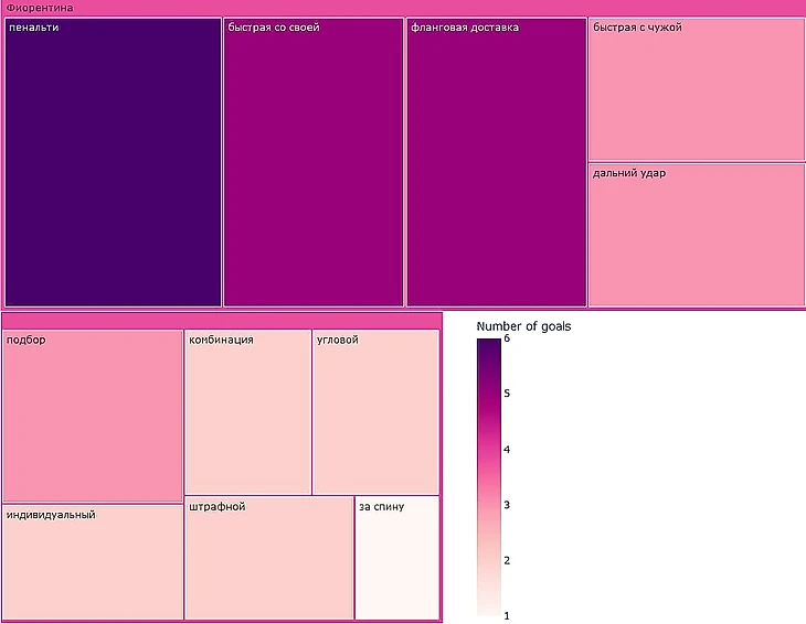 Данные по типологии голов еще интереснее: очевидно лидерство фланговых доставок и мячей, забитых на индивидуальном мастерстве. Подробнее о типологической классификации можно прочесть здесь (заключительный раздел).