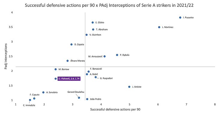 Влахович в Турине интересен прежде всего с точки зрения участия в завершении атак и как инструмент для преодоления прессинга, потому в этом разделе игрок будет рассмотрен именно в таком контексте.