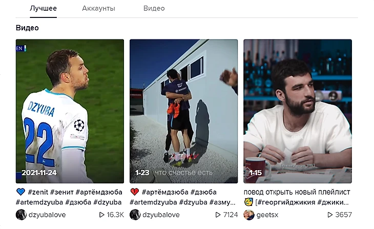 Третий способ – ввести в поиске хештег «Дзюба». Его можно отыскать даже через официальные видео «Зенита» – благодаря нему доступен вообще весь контент про игрока.