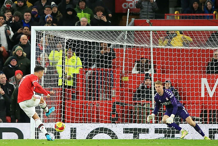 На 20-й минуте «Олд Траффорд» увидел то, к чему не привык: Криштиану Роналду промахнулся с пенальти. Португалец пробил низом в левый от себя угол, но не попал в ворота.