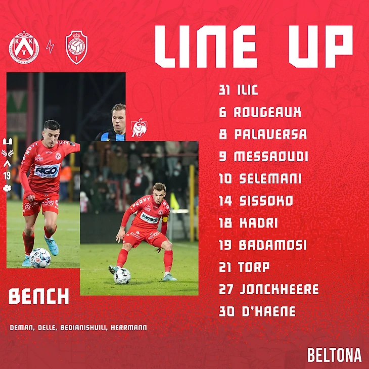 В итоге в заявку «Кортрейка» на матч с «Антверпеном» вошли всего 15 игроков, в том числе три вратаря. Таким образом, у Карима Бельосина было только два варианта замены полевых игроков: 21-летний нападающий Херрманн и 19-летний полузащитник Бедианишвили, который до этого в Про-Лиге еще никогда не играл.