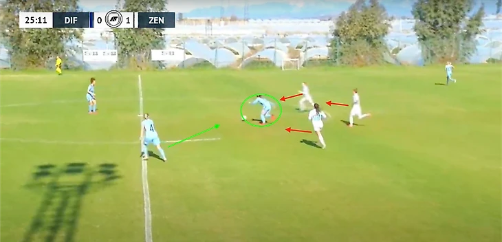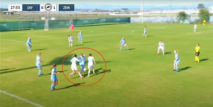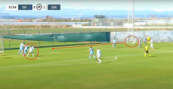 «Зенит» при потере мяча старался сразу накрывать на чужой половине поля. На двух скриншотах показано, что находящиеся ближе к мячу игроки старались вступать в отбор, чтобы не дать сопернику развернуть атаку на другой фланг и при возможности удачных действий, провести сразу контратаку на ворота шведской команды.