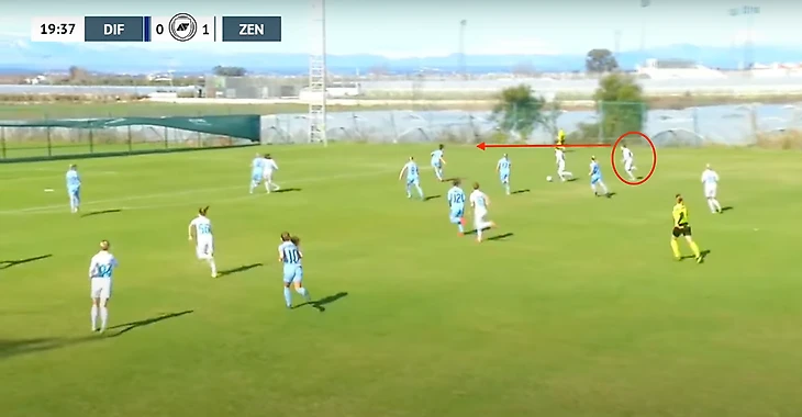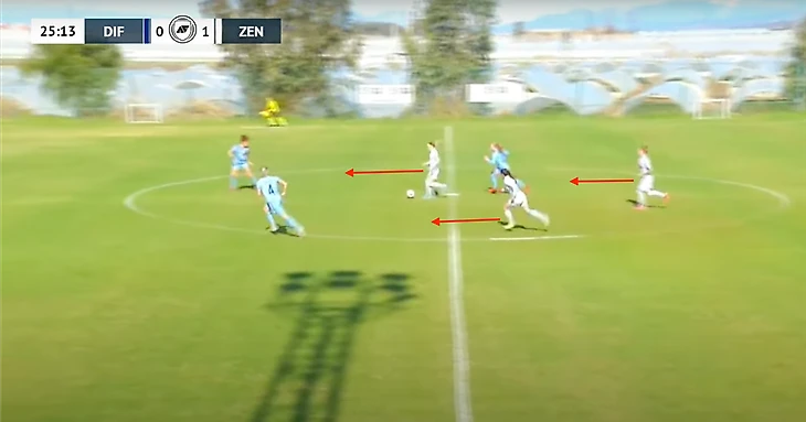 При развитии атаки от ворот «Зенит» практически не использовал центральных полузащитников и роль диспетчеров брали на себя крайние защитники команды.