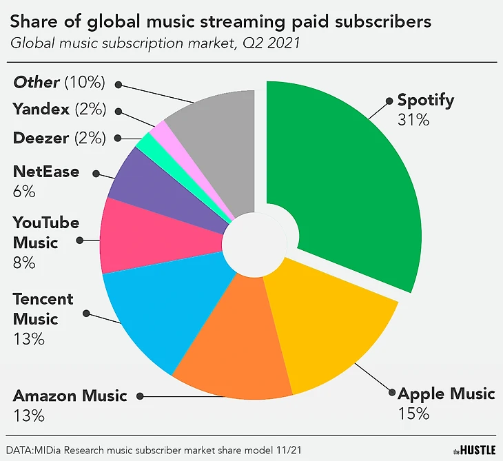 Согласно ноябрьскому исследованию MIDiA Research, Spotify – крупнейшая компания на мировом рынке музыкального стриминга. Его доля (по количеству платных подписчиков) – 31%, следом идет Apple Music – 15%, тройку замыкает китайский Tencent Music – 13% (кстати, доля «Яндекса» – 2%).
