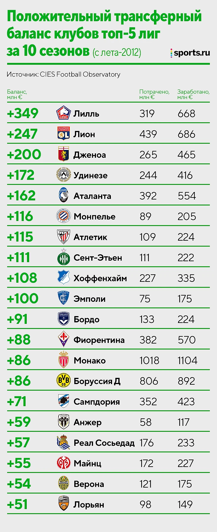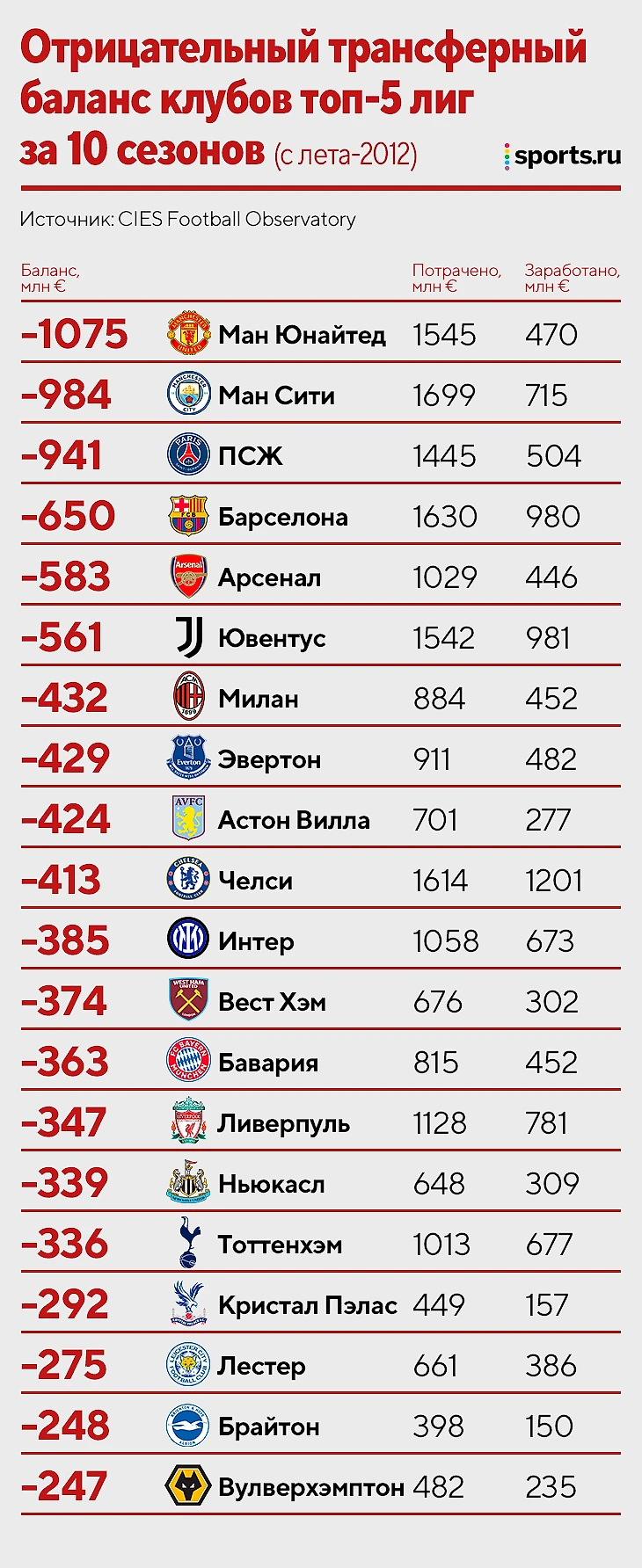 На днях Международный центр спортивных исследований (CIES Football Observatory) упорядочил клубы топ-5 лиг по трансферному балансу за 10 лет (с лета 2012-го). Получилось два рейтинга – с отрицательным балансом (клуб тратит на трансферы больше, чем зарабатывает на продажах) и положительным (клуб зарабатывает на продажах больше, чем тратит на покупки).