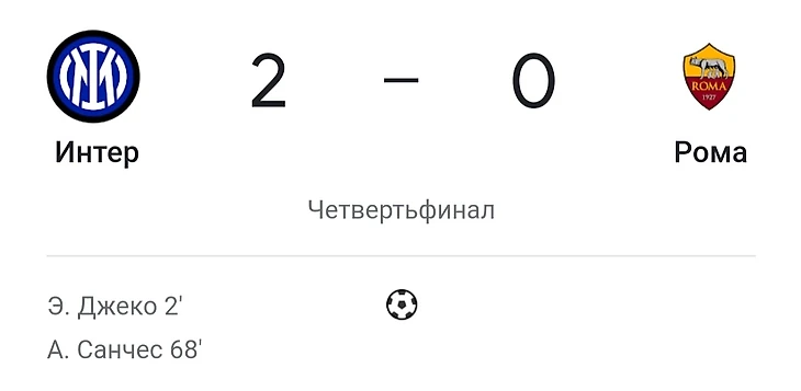 Рома же запомнилась 3-мя жёлтыми карточками в первом тайме,одну из них кстати получил главный тренер римлян - Жозе Моуриньо. Интер идёт дальше, а мы ждём оставшихся матчей чтобы узнать между кем будет разыграна путёвка в финал.