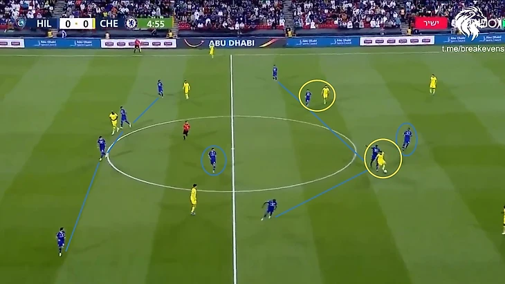 Леонарду Жардим выстроил оборону аравийцев по схеме 4-1-4-1. Базовой задумкой «Аль-Хиляля» оказалась личная опека Жоржиньо и Матео Ковачича. За опорниками «Челси» приглядывали два оппонента.