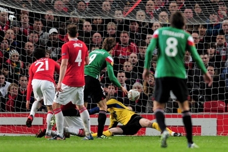 К чести «Атлетика», надо сказать, что команда не продемонстрировала никакой обреченности и продолжила гнуть свою линию. На 26-й минуте испанцы заработали угловой с правого фланга. Пробить по воротам не получилось, но атака басков продолжилась. Льоренте спиной к воротам получил пас и отбросил под линию штрафной на Ираолу, который метров с 14 рискнул пробить с правой справа от центра. Мяч нашел ногу защитника и ушел еще на один угловой. Хорошо так поднажали на ворота Де Хеа с 25-й по 30-ю минуты гости. Не сказать, чтобы крутился как белка в колесе голкипер «МЮ», но напряжение постоянно присутствовало, вот только манкунианцы из одного созданного момента сделали гол, а баскам из их десятка полумоментов никак не удавалось организовать по-настоящему голевой атаки. На 33-й минуте Сусаета имел такую шикарную возможность, что она еще будет сниться Маркелю, если его команда не пройдет «МЮ». Аккуратный заброс от Эрреры по центру на рывок Маркелю. Тот довольно легко оторвался от Эванса, но побоялся отпустить мяч и перебрасывал вышедшего из ворот Де Хеа, не войдя в штрафную. Стадион затаил дыхание, но «круглый» гулко стукнул по газону за левой штангой. «Атлетик» играл красивей в первом тайме, лучше, опасней. Не прошло и трех минут, как Итурраспе низом отдал передачу на правый край штрафной, где Ираола бил в ближнюю «шестерку» с правого угла вратарской, но сложился Де Хеа и перевел на угловой. Да, во всем в первом тайме переиграл своих матерых оппонентов. И по количеству угловых, и по владению мячом, но мяч в ворота Де Хеа упорно не шел, а если шел, то Давид выручал. У хозяев был совсем незаметен Эшли Янг, плюс еще до 40-й минуты Фергюсон, недовольный тем, что творится в обороне его команды, отправил разминаться Фердинанда. За 4 минуты до конца первого тайма двумя размашистыми атаками обменялись команды. Но если подача Ираолы с правого фланга на левый край штрафной получилась безадресной, то такой же кросс в исполнении Руни после сольного прохода по правой бровке пришелся в руки Ираолы. В концовке тайма раз за разом на правом крае атаки стал проявляться Руни. Шикарный перевод на Уэйна, который в касание пробросил себе мяч мимо защитника и прострелил на линию вратарской. Хави Мартинес там все равно опередил Эрнандеса, который к тому же и залез в офсайд. И все-таки справедливость восторжествовала! Лучше игравший «Атлетик» смог восстановить равновесие в счете еще до перерыва. Пас с левого фланга пошел на Льоренте, который с дуги штрафной бить не стал, а отдал на Сусаету. Маркель подумал и не пробил с правого угла штрафной, а покатил на Ираолу. Андони точно и тонко набросил снаряд в центр штрафной, где ворвавшийся Льоренте вколотил головой «круглого» как молотком с 9 метров мимо Де Хеа — 1:1. Одна добавленная минута ничего не принесла обеим командам, которые после свистка практически незаметного Майера, которому выпал не самый сложный тайм, потянулись в раздевалки.