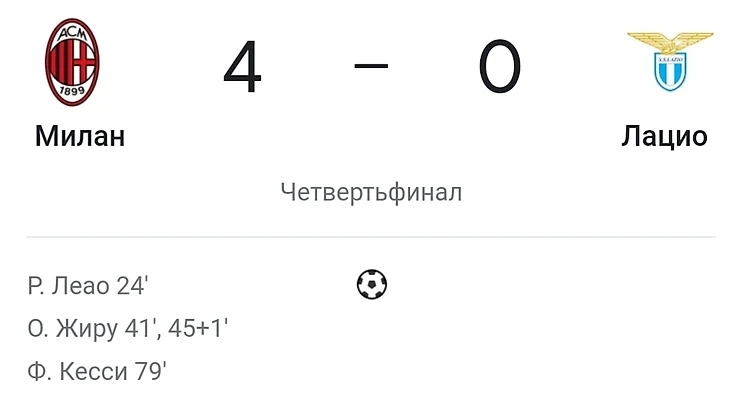 На 24-й минуте Леау открыл счёт получив мяч в штрафной и точно пробив по центру ворот. 41-я минута и вездесущий Оливье Жиру с передачи Б.Диаса делает счёт 2-0. 45+1 минута и вновь Жиру, реализует выходит один на один и впринципе ставит точку в матче. На 79-й минуте Франк Кесси ударом с отскока в нижний угол ворот устанавливает окончательный результат 4-0 в пользу Милана, который выходит в полуфинал,где его уже дожидаться Интер. А Лацио увы не показалось вообще ничего, хотя мы прекрасно знаем как умеют играть подопечные Сарри.