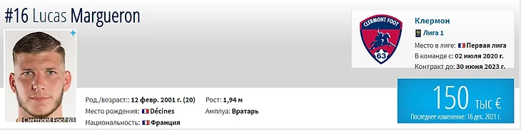 Про Маржерона, третьего вратаря "Клермона", который ещё ни разу не играл за эту команду, я могу сказать одно. Удивительно, но 20-летний резервный вратарь "Клермона" - единственный игрок в системе клуба, кто играл в еврокубковом турнире. Вы спросите, как такое возможно? Ответ прост: Люка Маржерон, уроженец Десин-Шарпьё, пригорода Лиона, с детства играл за "Лион", и в возрасте 17 лет Люка дебютировал за "Лион" на еврокубковой арене - в групповом этапе Юношеской лиги УЕФА (а что, чем вам не Европа?). За юношеский "Лион" Маржерон провёл 7 матчей, в которых пропустил 14 голов (чем-то похож на нынешнего Десма - не зря он за "Клермон" играет). Все эти матчи были в рамках Юношеской лиги УЕФА. За дубль "Лиона" Маржерону тоже удалось поиграть, но крайне мало (напомню, дубль "Лиона" играет в Четвёртой лиге Франции) - за два сезона он сыграл 4 матча и пропустил в них 9 мячей. Нынешний этап карьеры Люки начался с того, что в июле 2020 года "Лион Б" не стал продлевать с ним контракт, и свободным агентом его подобрал "Клермон". Сейчас Люка Маржерон, по сути, только лишь тренируется с "Клермоном", никак не помогая команде ни в лиге, ни в кубке (ни одного матча за "Клермон" почти за два года). Я сомневаюсь, что Маржерон сохранит своё место в "Клермоне": скорее всего, после того, как истечёт срок контракта (июнь 2023 года), Маржерон отправится в поисках игровой практики в команды второго-третьего французского дивизиона, где на него, как на воспитанника "Лиона" и молодого вратаря, будут возлагать большие надежды и чаще выпускать в стартовом составе. "Клермону" Маржерон не нужен совершенно - и сам Люка это прекрасно понимает...