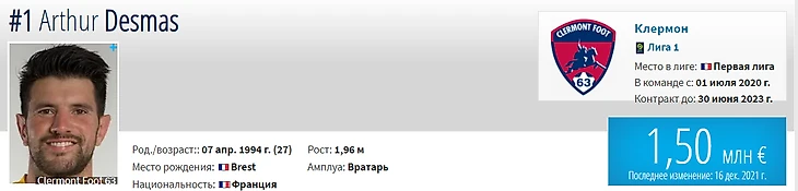 Артур Десма - вратарь, родом из города Брест (это самый-самый запад Франции, побережье Атлантики), перебравшийся в Клермон недавно, летом 2020 года. Очень необычен тот факт, что к неполным 28 годам Десма поиграл всего за три клуба: разумеется, начал он, как все остальные мальчишки из Бреста, в местной школе-академии Бреста, прошёл все уровни подготовки, пробился в дубль Бреста, после чего не смог закрепиться в команде и был взят свободным агентом в клуб "Ньор"(для непосвящённых скажу, что клуб Ньор - это вечный середняк французской "Лиги 2"). Период в Ньоре для Артура нельзя назвать успешным, потому по окончании сезона 17/18 молодой вратарь, будучи второй раз свободным агентом, переходит в новый для себя клуб - французский же "Родез". Говоря про эту команду, надо отметить, что в сезоне 18/19 она играла даже не во второй, а в !!!четвёртой!!! лиге Франции с красивым названием "Насьональ Чемпионат". Очевидно, что подписание контракта с "Родезом" Артур воспринял как последний шанс задержаться в профессиональном футболе, поэтому он начал усерднее тренироваться, но демонстрировать хорошую игру получалось не всегда - в "Насьональ Чемпионате" и Десма, и вся команда выглядели неплохо, а поднявшись в суровую Лигу 2 получили проблемы - за 27 матчей сезона многострадальный вратарь "Родеза" пропустил 34 мяча, то есть пропускал чуть больше 1, 25 мяча за игру - проще говоря, Десма в Лиге 2 за "Родез" пропускал каждый матч. Благо в том сезоне "Родез" ухватился за спасительное 16-ое место, однако нашего с вами Артура это не спасло, двухлетнее соглашение с ним завершилось, и Артур Десма отправился не в полулюбительские и любительские команды, а был подобран... "Клермоном" перед началом нового сезона 20/21.Тогда Клермон был одним из сильнейших клубов Лиги 2 и вполне серьёзно намеревался занять проходные 1-2 места по итогам сезона. И в Клермоне Десма быстро стал основным, своей игрой на протяжении сезона показав, кто здесь номер 1. Просто вдумайтесь: из 36 матчей сезона Артур Десма целый 21 матч провёл на ноль, правда в остальных 15-ти он пропустил 22 мяча... Но вратарь, который год назад в той же Лиге пропускает каждый матч и вратарь, который не пропускает в половине матчей чемпионата - казалось бы, это совершенно разные игроки, но нет - это один и тот же вратарь Артур Десма! Как известно, в том выдающемся сезоне 20/21 "Клермон" занял второе место и завоевал право впервые в своей истории выступать в Лиге 1. Дебютный для клуба сезон в высшем дивизионе Франции Десма начал как ключевой игрок и, естественно, как основной вратарь команды. Но то ли волнение, то ли разница в классе, то ли злой рок привели к тому, что Десма начал невероятно часто ошибаться, играть бледно, нестабильно, с большим количеством брака, и по итогу Паскаль Гастьен, тренер команды, в течение 13 матчей наблюдавший откровенно неудачную игру своего кипера, посадил Десма в глубокий запас. В данный момент, Артюр Десма, пропустивший 26 мячей (2 мяча за матч) в 13 играх, греет лавочку в клубе "Клермон". Что касается его будущего, то тут возможны два варианта: либо он сократит зарплату и согласится на статус игрока запаса в "Клермоне"; либо ставшего к концу сезона 28-летним вратаря лишат контракта, который, правда, заканчивается только через год - в июне 2023.