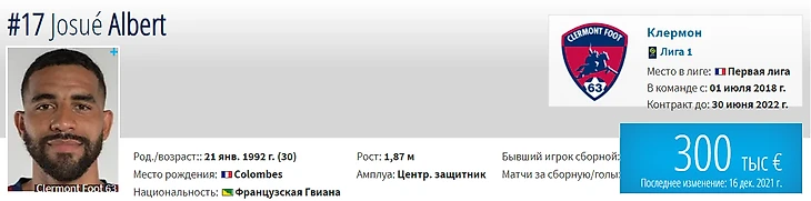Наш резервист также представляет эмигрантскую семью: родители Жозуе - выходцы из Французской Гвианы, но сам Жозуе родился уже здесь, во Франции, в коммуне Коломб, что недалеко от Парижа. Футбольное творчество в жизни Альбера зародилось в клубе "Сент-Этьенн B", дубле "Сент-Этьенна". Летом 2011 года молодой, 19-летний Альбер отправился в точно такой же дубль, но на этот раз в дубль "Генгама", откуда после двух сезонов ушёл в клуб "Узес" из "Чемпионат Насьоналя". Забавный момент: Альбер сыграл за клуб 7 матчей подряд в старте (с 1-го по 7-ой тур) в сезоне 13/14, заработав за это время одну жёлтую и пропустив за эти игры 11 мячей, то есть 1.57 мяча за игру, после чего тренер "Узеса" до конца сезона убрал Альбера из состава. Сам клуб свалился на последнее 18 место и оказался в дивизионе пониже. А гвианец спокойно расстался с командой и перед началом сезона 14/15 перешёл в команду "Кевийи", но, не сыграв ни одной игры, Жозуе Альбер в сезоне 15/16 по неизвестной причине был отправлен в дубль команды, в "Кевийи В", где опять же по неизвестной причине сыграл всего один матч - против "ПСЖ II", закончившийся без голов. В следующем розыгрыше чемпионата Альбер уже находится в расположении основной команды "Кевийи", но всё равно не играет: единственная гостевая встреча против "Бастии" (1:1) сыграна Альбером в том сезоне в старте. Поднявшийся в Лигу 2 "Кевийи" начал новый сезон 17/18 опять без нашего французского гвианца, но в середине сезона взгляды руководства изменились. Не попадавший в заявку в течение 19-ти матчей Жозуе Альбер вдруг играет в старте сразу в трёх турах подряд (в матче с "Сошо" Альбер играл против Флорана Ожье), после чего опять вылетает из заявки на несколько игр, а концовку сезона на протяжении 11-ти матчей играет от первой до последней минуты. Интересно, что за эти 14 матчей Альбер не набрал ни голов, ни карточек, ни удалений. В этих играх "Кевийи" пропускал по 1.78 гола за матч, что невероятно много. Без Альбера не лучше - 1.75 голов за игру. Ну конечно же, такая "надёжность" в обороне позволила "Кевийи" добраться до 19-го места в лиге, позволяющее команде воспользоваться автоматическим вылетом в Третий французский дивизион. Жозуе Альбер, показав себя в Лиге 2, был замечен скаутами "Клермона", и к новому сезону 18/19, в возрасте 26-ти лет, уже был в Клермон-Ферране. Дебютный год за "Клермон" оказался смешанным: в первых матчах сезона Альбер выходил на замену в пару к Флорану Ожье, а несколько матчей даже проводил в стартовом составе. Начиная с 11-го тура Альбера накрыла чёрная полоса пребывания в запасе, и только в 25-ом туре Жозуе Альбер вновь вышел в старте. Остаток сезона прошёл в чередовании пребывания в запасе и выходов в старте. В матчах с участием Альбера в сезоне 18/19 было пропущено 17 мячей - ровно 1 мяч в среднем за игру; сам Альбер получил три жёлтых, две из которых превратил в одну красную. Следующий сезон выдался чуть хуже: всего 8 матчей в старте, 2 выхода на замену и одна жёлтая карточка. Зато порадовала надёжность: с Альбером команда пропускала всего 0.8 гола за матч, а без него - 1.0. Триумфальный для "Клермона" сезон 20/21 не был столь триумфальным для Жозуе Альбера: наверное, это один из худших его сезонов вообще - из 38 туров Альбер поучаствовал только в пяти (4 раза выходил на замену и только один раз начинал встречу в старте - это был матч с "Валансьеном"). Не знаю, стоит ли приводить за этот сезон ст