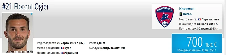 Единственный коренной француз среди центральных защитников клуба "Клермон". Родился Флоран в далёком 1989 году в одном из крупнейших городов Франции, богатом футбольными традициями, - в Лионе. Всё началось для юноши в системе академии клуба "Гренобль", где Ожье выступал в дублирующей команде - "Гренобль В" и летом 2009 года перешёл в футбольный клуб "Лион-Дюшер", откуда спустя сезон, в 21 год, перебрался в довольно серьёзный для истории французского футбола клуб "Дижон". В те годы "Дижон" неплохо показывал себя в Лиге 2, и перспективный новичок почти половину сезона выходил в стартовом составе. Когда Флоран Ожье был на поле, то его "Дижон" пропускал в среднем 1, 56 мяча за игру (за "Дижон" Ожье провёл 16 матчей). Для сравнения в оставшихся в 18 матчах (в которых Флорана не было даже в заявке) "Дижону" забили 15 мячей в 18 матчах, то есть без Ожье в составе клуб пропускал значительно меньше - всего 0.8 мяча за игру. Руководство французского клуба, так же, как и мы с вами, заметило эту тенденцию, и после завершения сезона, в котором "Дижон" значительное время держась в середине таблицы, под конец чемпионата вдруг выскочил на третье, "повышающее в классе" место. А для нашего ненадёжного француза место в высшем дивизионе не нашлось, и новый сезон 11/12 Флоран Ожье начинает в аренде в клубе "Расинг Безансон" - аутсайдере Третьей французской Лиги. Вполне очевидно, что аутсайдер "Насьональ Чемпионата" будет регулярно ставить такого игрока, как Ожье в стартовый состав. Так и произошло: Ожье отыграл целых 33 матча из 38 в старте, но поразительной надёжности для третьего дивизиона француз не продемонстрировал - те же 1, 57 пропущенных мяча за игру. В итоге "Расинг" с грустью и печалью упал в Четвёртый дивизион, а Флоран Ожье в июне 2012 года вернулся в "Дижон". Но, как мы поняли из прошлого сезона, Ожье "Дижону" был не нужен совершенно, а хоть каких-то покупателей для Ожье найти было трудно. В итоге, не получая игровой практики в течение полугода, Флоран Ожье зимой 2013 года соглашается на контракт со скромным "Парижем" сроком на полгода. Вернувшись в "Насьональ Чемпионат" Флоран Ожье провёл за "Париж" 16 матчей из оставшихся 19-ти (стоит нам взглянуть на статистику, как мы увидим, что Ожье начал играть надёжнее - 1, 37 мяча за матч; но вместе с ростом надёжности, выросла и жёсткость Ожье как футболиста: если в матчах за "Дижон" француз получил всего 1 жёлтую карточку, то за половину сезона с "Парижем" - целых 5). Несмотря на относительный индивидуальный прогресс, у команды Ожье были не лучшие времена - по результатам сезона "Париж" занял 17-ое место, вылетел в Четвёртый дивизион и был вынужден расстаться с Ожье ради экономии бюджета. Но Ожье не остался без футбола надолго: тем же летом его подобрал к себе клуб "Пуаре-сюр-Ви" из Третьего дивизиона Франции. Удивительно, но после 19-ти сыгранных от начала до конца матчей Флоран перестал попадать даже в заявку команды из Третьего дивизиона. Да, в плане надёжности Ожье разочаровал (с ним - 1, 78 пропущенных мяча за игру; без него - 1, 26 мяча), зато впервые забил целых 2 мяча за сезон (оба в ворота "Булони", но в разных матчах). Шедший при Ожье в старте на последних местах, конец сезона для "Пуаре-сюр-Ви" выдался успешным: команда сохранила место в дивизионе, уверенно поднявшись на 13 место. Но зато не сохранил своё место в клубе наш Флоран Ожье - осенью 2014 года он был подписан ком