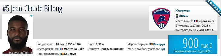Ну что тут скажешь, перед нами типичный для "Клермона" игрок - камерунец, родившийся в семье мигрантов близ Парижа, в городке Мант-ла-Жоли. Первый опыт полупрофессионального футбола совсем ещё молодой Жан-Клод получает в такой команде как "Кретей-Лузитанос" а точнее в её дубле. Отсюда - с сезона 10/11 - берёт своё начало карьера Биллонга как футболиста. К сожалению, сразу проявить себя у 17-летнего камерунца не получилось, поэтому в этом же сезоне 10/11 он переходит в клуб "Мантуа", в котором неплохо играет целых два года, после чего в 2014 году подписывает контракт с дублем американской команды "Нью-Йорк Ред Булз", известной как "Нью-Йорк Ред Буллз II" (на удивление, прослеживаются некоторые совпадения с Седриком Унтонджи). В США у камерунца не получилось настолько, что американцы спустя год оставили его без контракта, но где-то там далеко-далеко в жаркой Португалии нашёлся "Лэйшоэш", готовый сотрудничать с Жан-Клодом. Для Биллонга вторая лига Португалии, где выступал "Лэйшоэш" была той самой возможностью продать себя в Европе. И у Биллонга получилось - за 25 тысяч евро он перешёл в словенский клуб "Рудар", и состоялся этот словено-португальский трансфер в июле 2016 года. Конечно, для словенского чемпионата Биллонг - это топ-трансфер: камерунец тут же ворвался в стартовый состав словенцев, и первом же сезоне принял участие в 27 матчах (всего в чемпионате 36 матчей), из которых выходил в старте 21 раз, и забил целых 2 гола. В тот год "Рудар" стабильно и уверенно шёл в середине таблицы, равномерно отдаляясь как от зоны вылета, так и от лидирующих позиций, так и завершив сезон на 7-ом месте. Что касается самого Биллонга, то стоит заметить его большую вольность, по сравнению с Седриком Унтонджи: за 27 матчей камерунец собрал багаж из 6 жёлтых карточек - стоит задуматься тренеру! Сезон закончился, но закончилось и пребывание Биллонга в качестве игрока "Рудара": летом 2017 года франко-камерунец на правах свободного агента направился (простите за тафтологию) в прекрасный клуб "Марибор" из всё той же словенской Первой Лиги. Этот сезон 17/18, я думаю, запомнится Жан-Клоду надолго: едва подписавший камерунца "Марибор" посадил его в запас на матчи квалификации Лиги чемпионов (да, "Марибор" регулярно выходит в Лигу чемпионов как, соответственно, многократный чемпион Словении), однако на осенние матчи уже группового этапа ЛЧ тренер "Марибора" не просто давал камерунцу игровое время, а выводил его в старте в 4 из 6 матчах группы (стоит сказать, что "Марибору" в том розыгрыше не очень повезло - он попал в группу с "Ливерпулем", "Севильей" и московским "Спартаком", с каждой из этих команд сыграл в ничью и получил три жестоких разгрома - 0:3 от "Севильи", 0:7 и 0:3 - от "Ливерпуля"), так что дебют в Лиге чемпионов для Жан-Клода Биллонга совершенно не задался. В чемпионате и у "Марибора", и у Биллонга дела шли куда лучше: "Марибор" проиграл в том сезоне лишь однажды, а Биллонг в старте был в 14-ти из 18 матчей национального первенства, в которых играл достаточно надёжно ("Марибор" с Биллонгом в составе пропустил 11 мячей в 14 матчах, то есть 0.78 мяча за игру, но забавный факт: без Биллонга в оставшихся 4 матчах "Марибор" не пропустил ни разу). В результате и "Марибор", и Жан-Клод Биллонг стали чемпионами Словении, однако золотой словенский требл "Марибору" выиграть не удалось - команда проиграла в четвертьфинале Кубка Словен