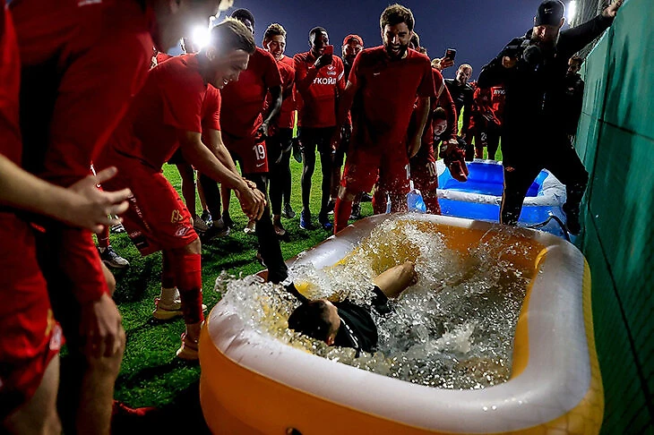 🛁 Жесткая традиция в «Спартаке»: бросают в ванну со льдом тренера по физподготовке. Освежили и нового итальянца
