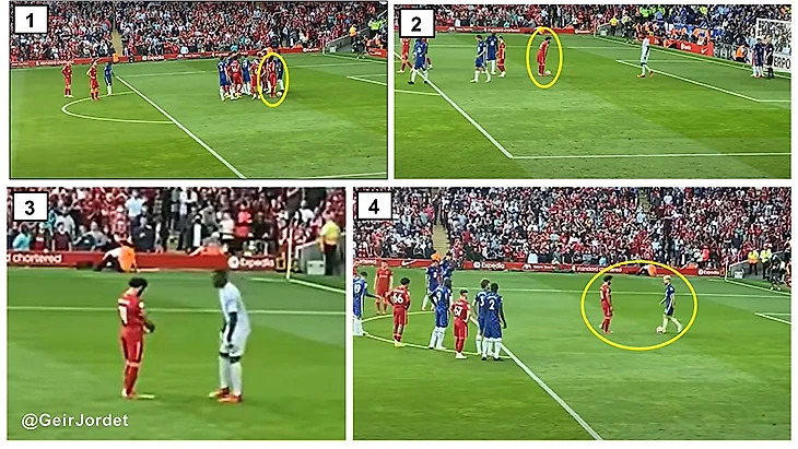 Вот его пример, как команда Клоппа защищала Мохамеда Салаха – именно в матче с «Челси». Египтянин спокойно стоял у точки, пока его партнеры массивно спорили с соперниками в нескольких шагах от Салаха.