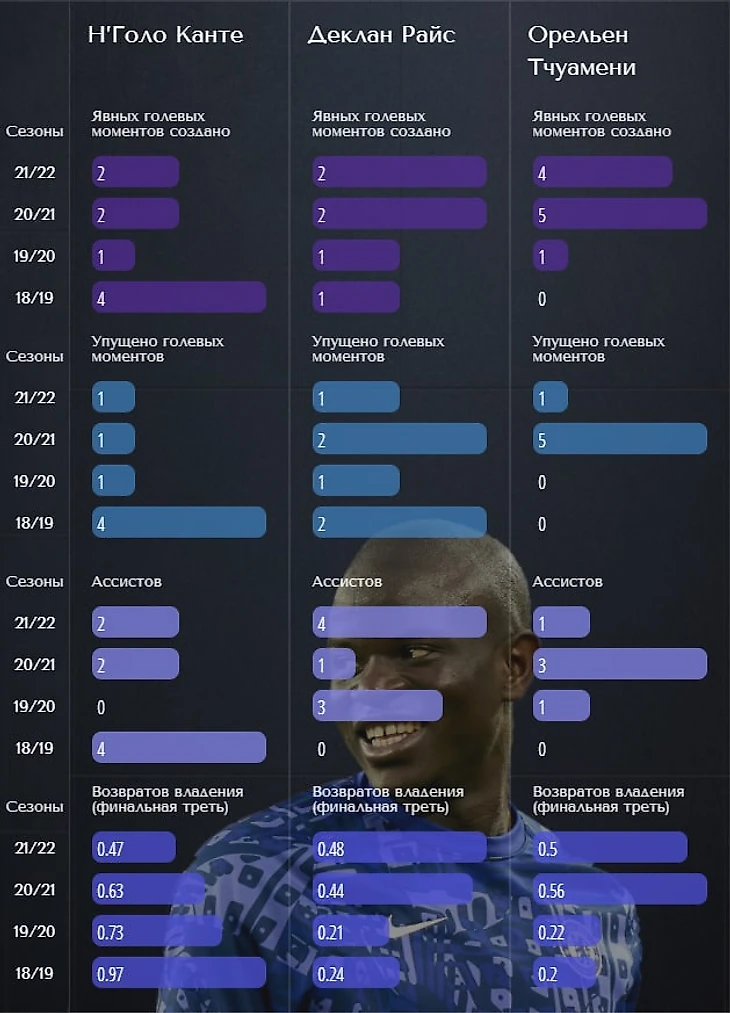 По части ключевых передач Н'Голо пока исключительно сдает. Его "конкуренты" прибавляют, хотя пока не могут добиться тех же показателей, что были у француза в сезонах с 2018 по 2020 годы.