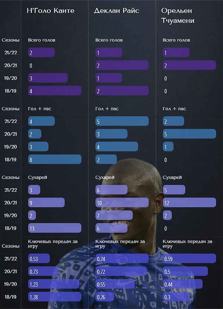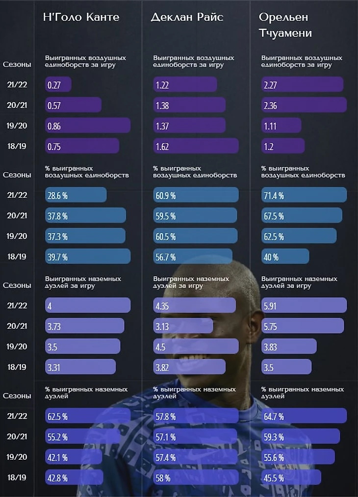 Однако даже в такой конфигурации Канте был просто восхитителен с 18 по 20 годы, так что Райсу и Тчуамени нужно еще долго пахать, чтобы до такого уровня дорасти.