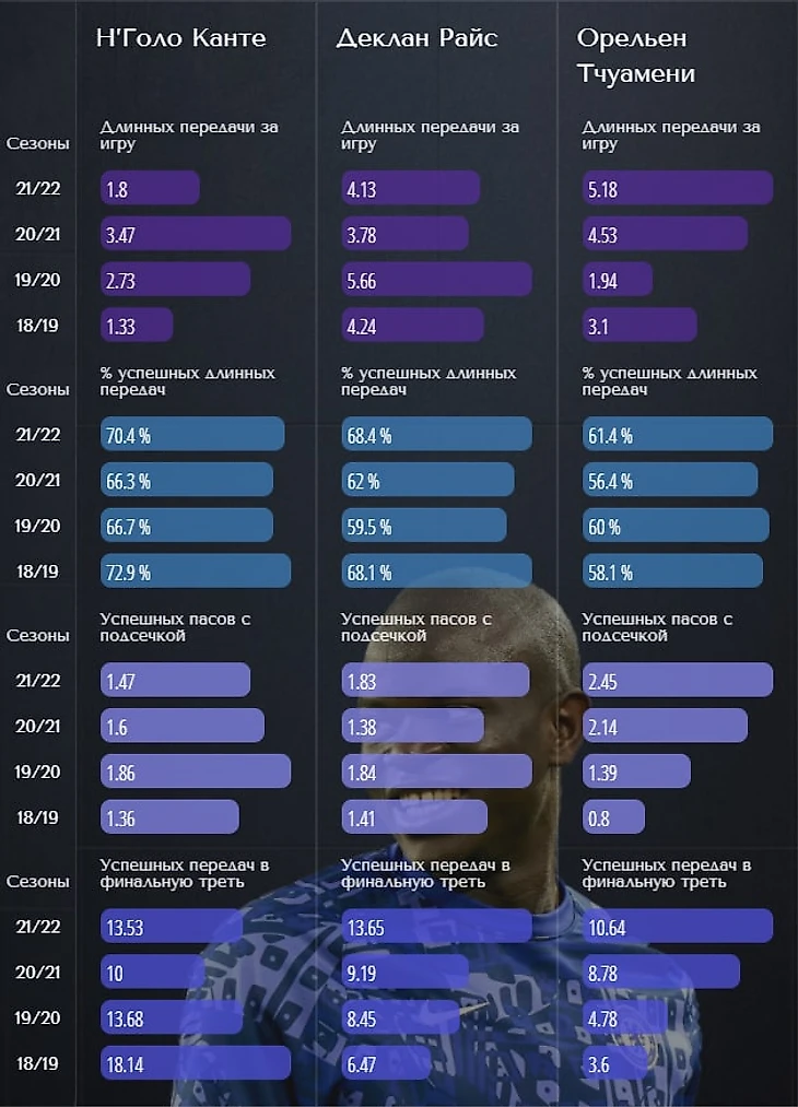 У Канте - это излюбленный вид передачи. То же самое можно сказать и о Тчуамени. Райс же предпочитает отдавать именно длинные пасы.