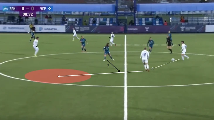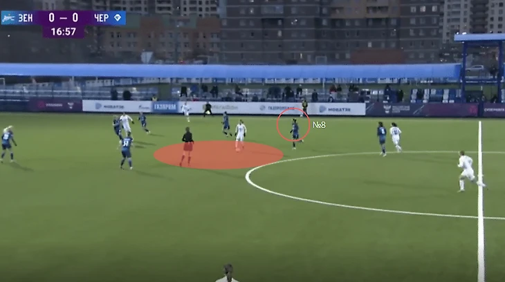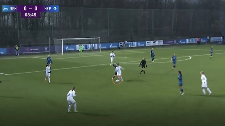 Полузащитники "Зенита", прессингуя "Чертаново", оставляют свободную зону для дальнейшей атаки соперников через центр. Ника Белова (№8), вместо того, чтобы сократить расстояние до №8 "Чертаново", ждет действие Трофимовой. Трофимова это видит и отдает Андреевой передачу.
