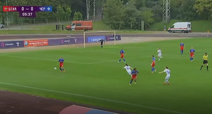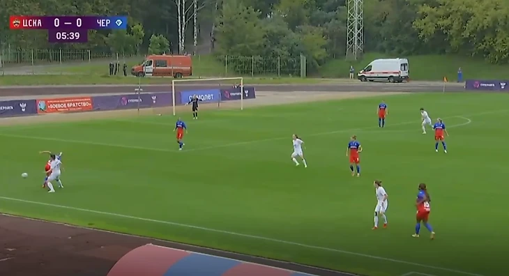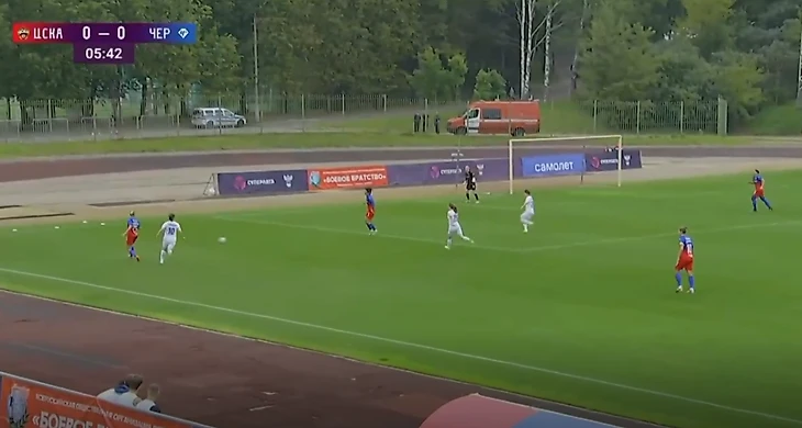 ЦСКА - "Чертаново", 26-08-2021. Снова выход из обороны. На этот раз от ЦСКА. Эпизод, немного напоминающий предыдущий. Правый защитник красно-синих Ксения Коваленко (№25) не замечает стремящуюся к ней Трофимову. В моменте Коваленко не поднимает голову. Не прочитав угрозу, она дает себе время на обработку мяча.