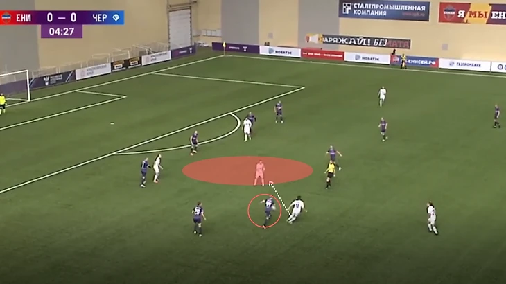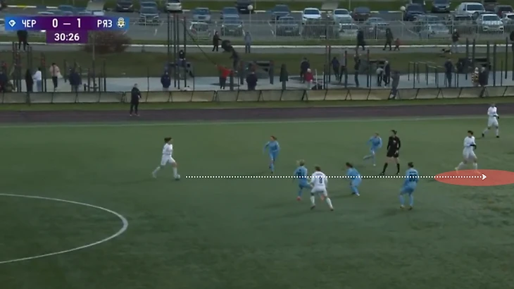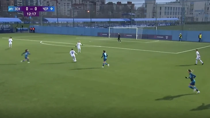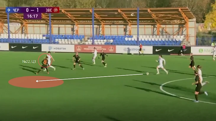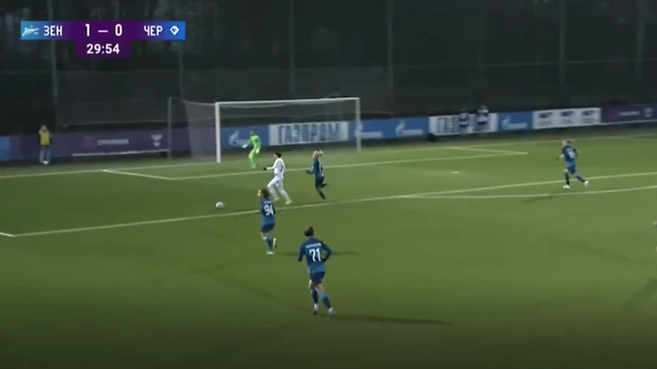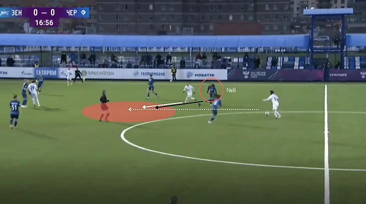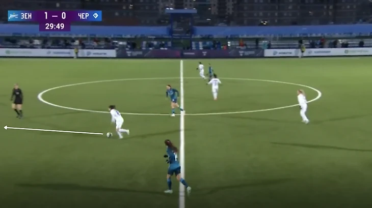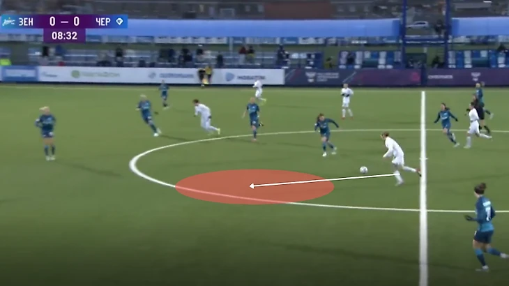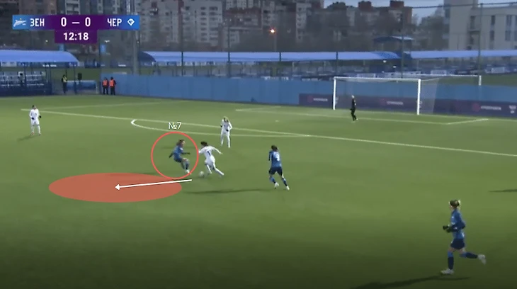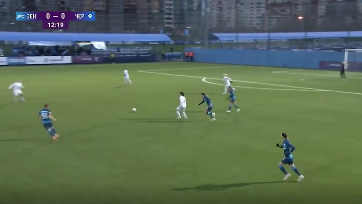 "Зенит" - "Чертаново", 13-11-2021. Полузащитники "Зенита" из-за плохой компактности в прессинге дают Трофимовой совершить рывок, который заканчивается обостряющей передачей на центрфорварда "Чертаново".