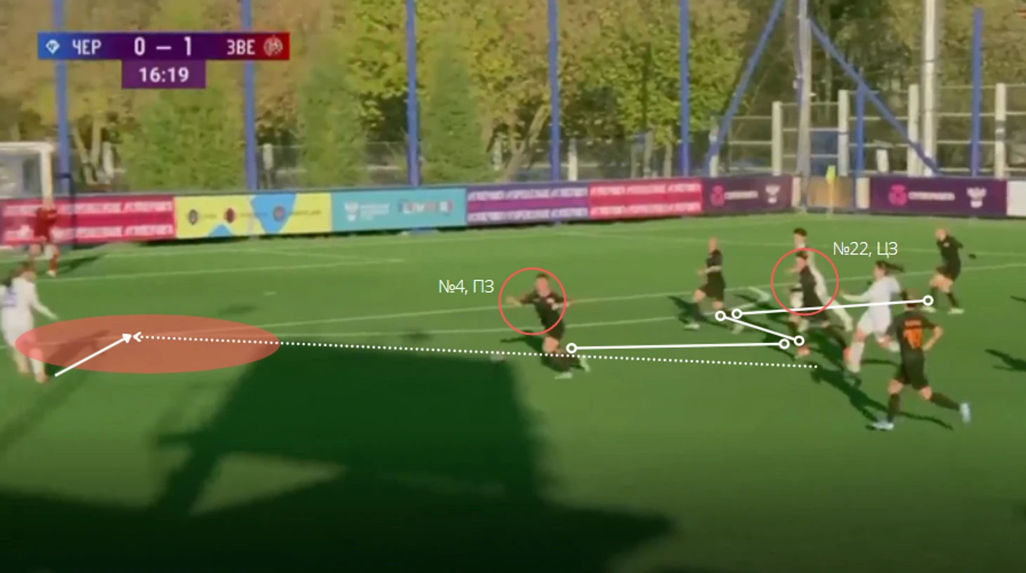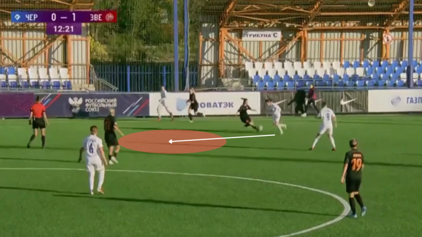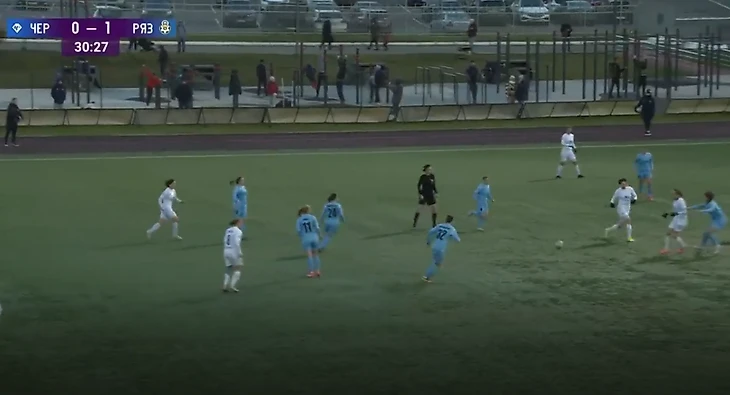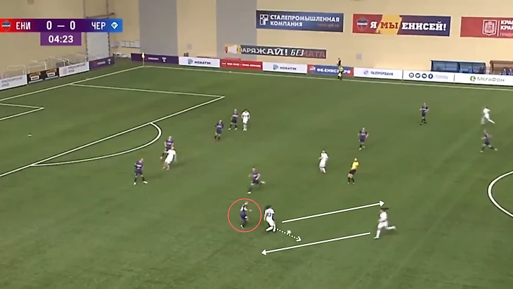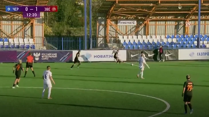 "Зенит" - "Чертаново", 13-11-2021. Полузащитники "Зенита" из-за плохой компактности в прессинге дают Трофимовой совершить рывок, который заканчивается обостряющей передачей на центрфорварда "Чертаново".