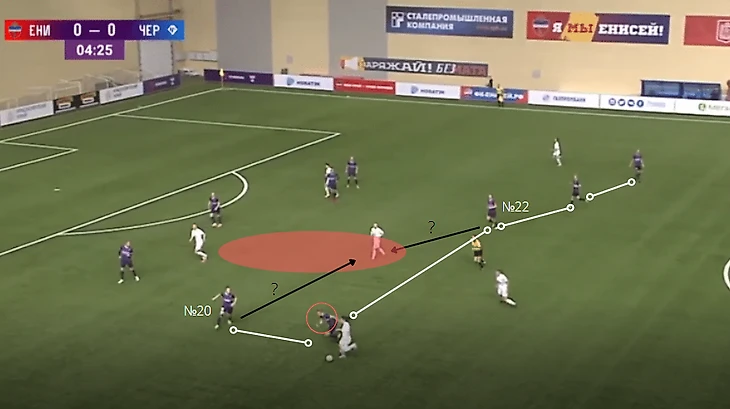 Валерия Алешичева ("Енисей", №20) бросает зону, отмеченную красным цветом и идет на подстраховку к Шейкиной. Параллельно с этим, красную зону не страхует Татьяна Ананьева ("Енисей", №22), находящаяся в момент эпизода на месте центрального полузащитника. Это приводит к разрыву между линией обороны и полузащиты.