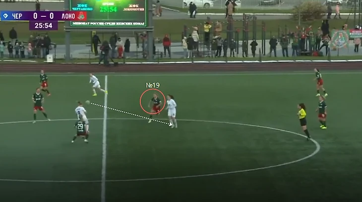 Однако, Трофимова выходит из-под прессинга "Локо" победителем. Козлова (№29) и Федорова (№19) оставили маленький коридор, через который мяч проходит передачей в одно касание.