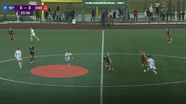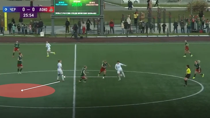 Анастасия Тренькина (№24) после игры в стенку с Трофимовой вбегает в пустую зону, отмеченную красным кругом. Ника Белова (№8) допускает ошибку, не совершив опеку над №24 "Чертаново". Трофимова быстро обрабатывает мяч и разрезает двух футболисток "Зенита" передачей.