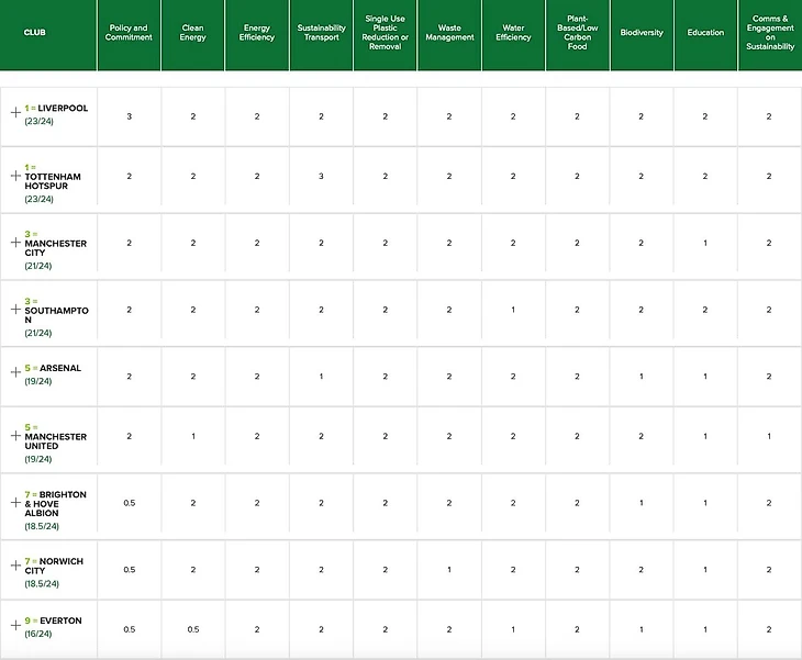 Компания Sport Positive обсчитала все клубы АПЛ (эх, где они были, когда я писал диссертацию) с точки зрения влияние на окружающую среду. Оценивались энергоэффективность, менеджмент отходов, использование пластика и другие повесточные штуки.