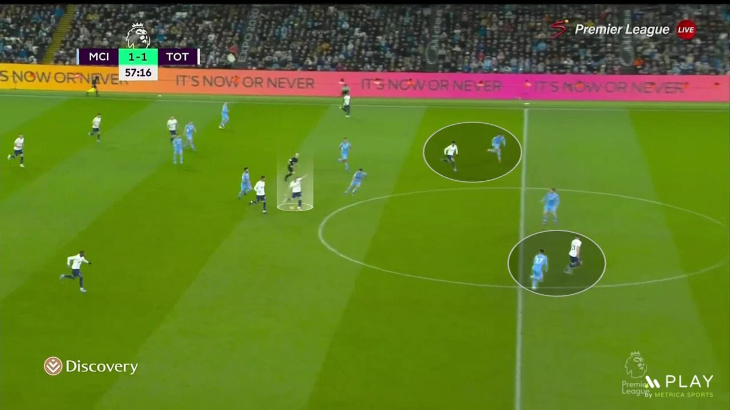 В моменте с первым голом нужная ситуация родилась из неудачной попытки прессинга «Сити». «Тоттенхэм» сделал ряд провоцирующих передач, дождались, пока Кайл Уокер вытянется в поддержку прессинга (а сзади образуется 3-в-3) – и именно в этот момент последовал пас на Кейна со всеми вытекающими: