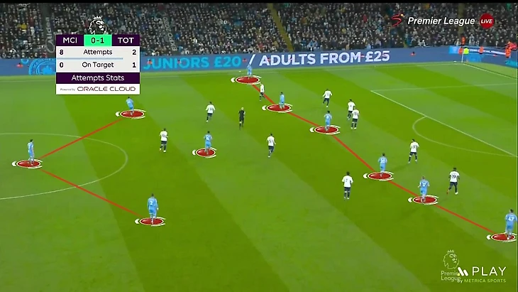 В атаке «Сити» использовал структуру, в которой по всей ширине поля в последней линии располагается 5-6 игроков. Атаки начинали трое защитников (центральные и Уокер), Родри держал опорную, а шестерка игроков созидала: