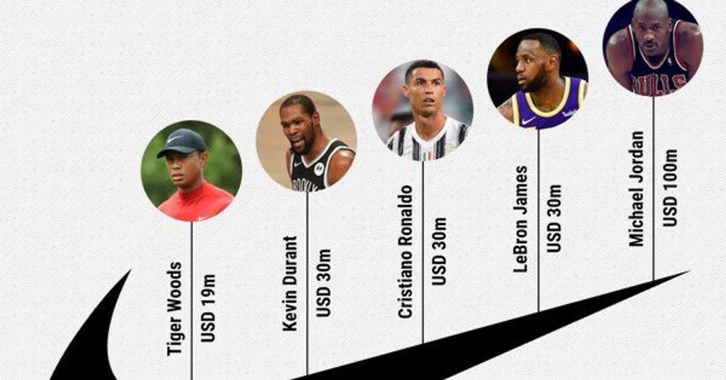 Самым большим контрактом с Nike обладает Майкл Джордан. Он получает по 100 млн долларов в год, а его состояние оценивается в 1,6 млрд долларов. Кстати, у Джордана, Роналду и ЛеБрона с Nike заключены пожизненные контракты, так что получать от них кэш они могут неограниченно долго.