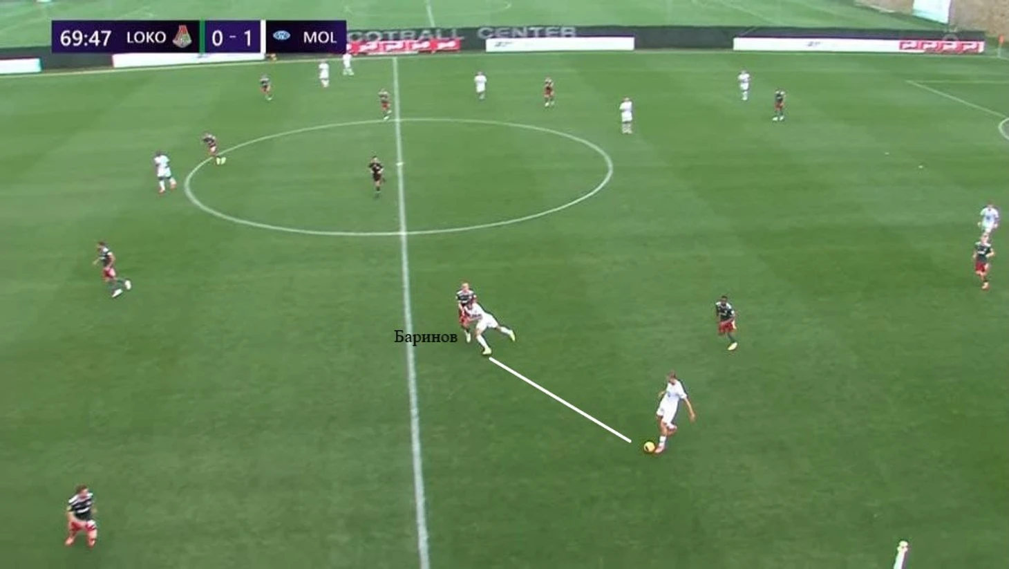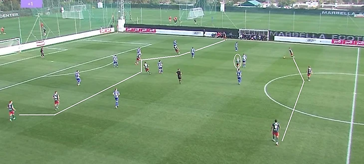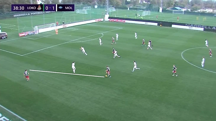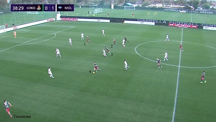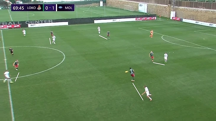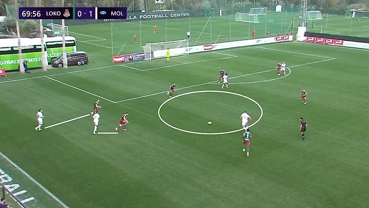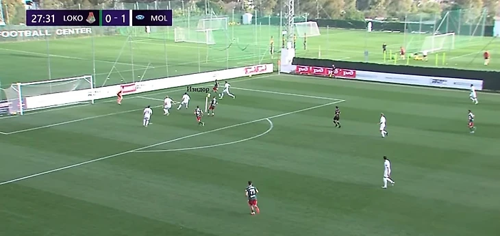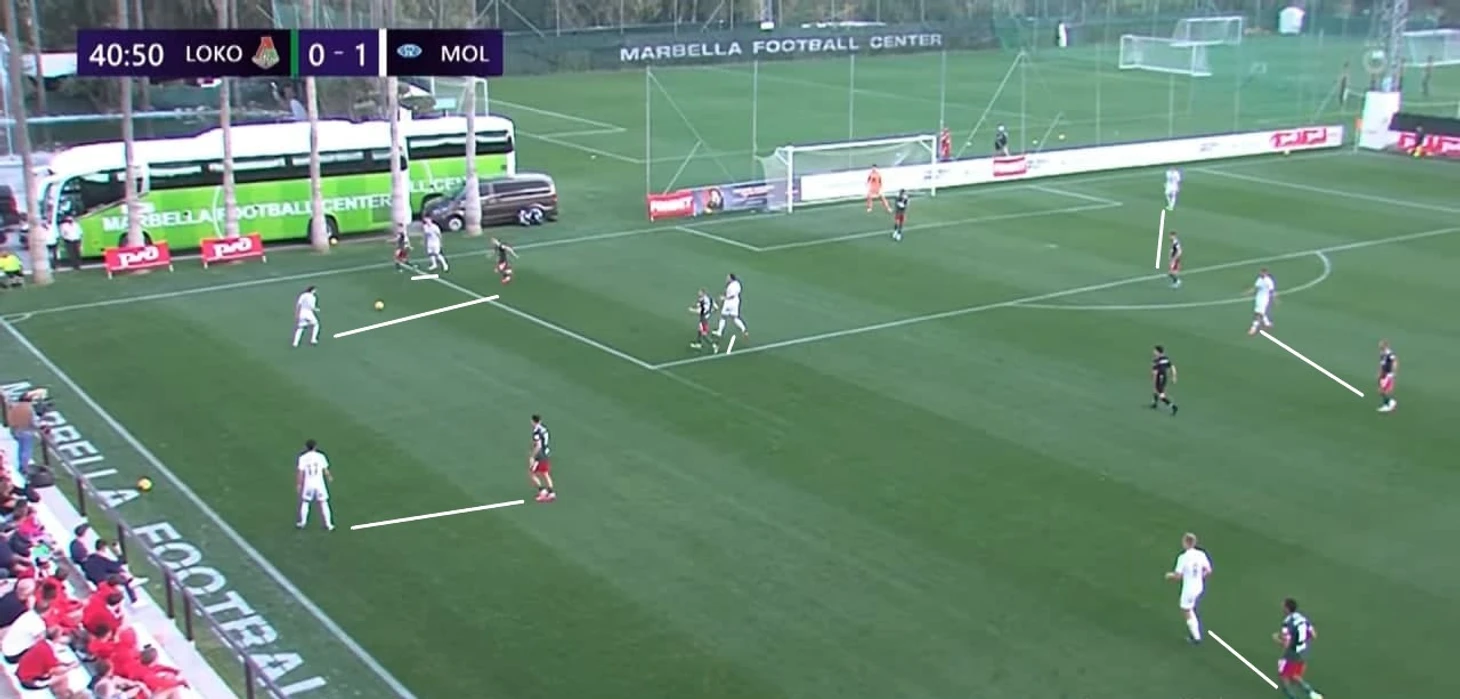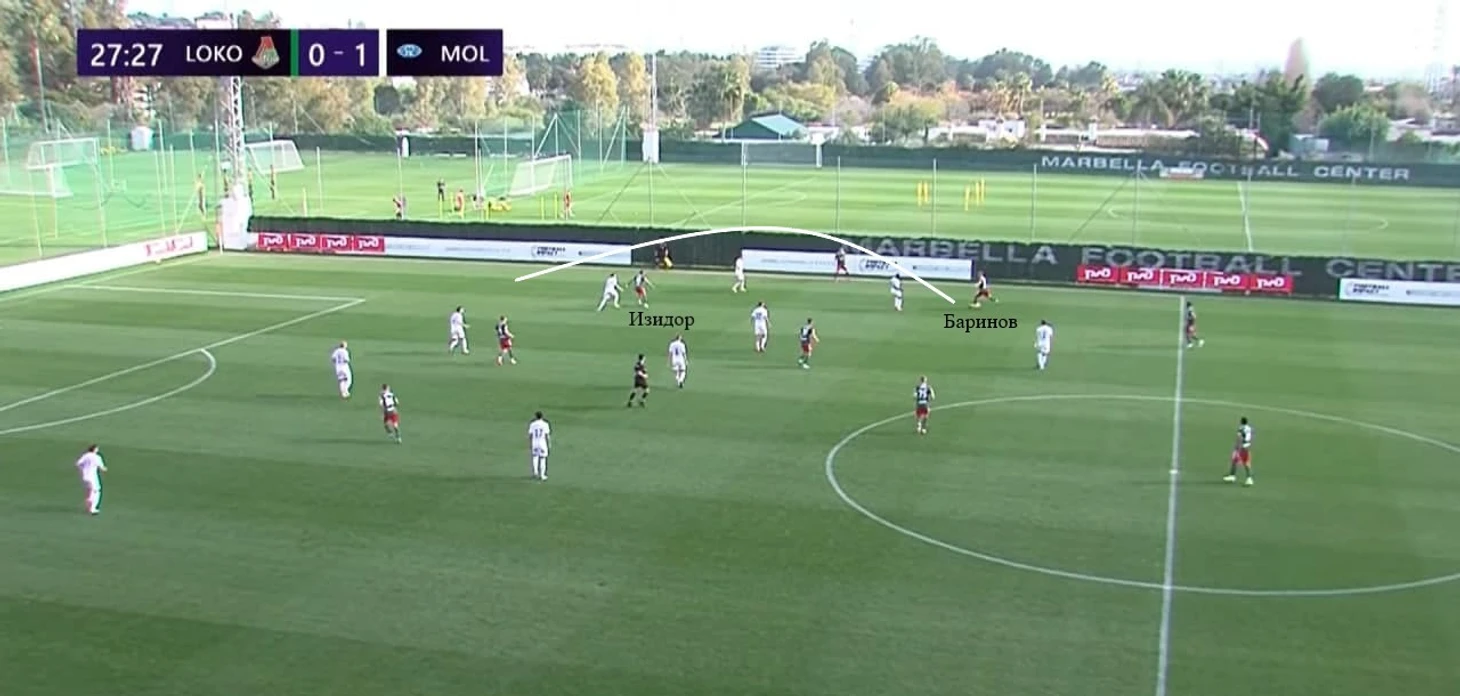 Ещё один частый розыгрыш зимнего «Локо» Гиздоля – вертикальная атака верхом или низом по флангу. Получая мяч в средней трети, крайний защитник (или опорник в первой линии) искал передачей партнера, смещающегося к чужой штрафной из полуфланга. Так, к примеру, был создан отличный момент для Яна Кухты в игре с «Мольде» – чех не забил.