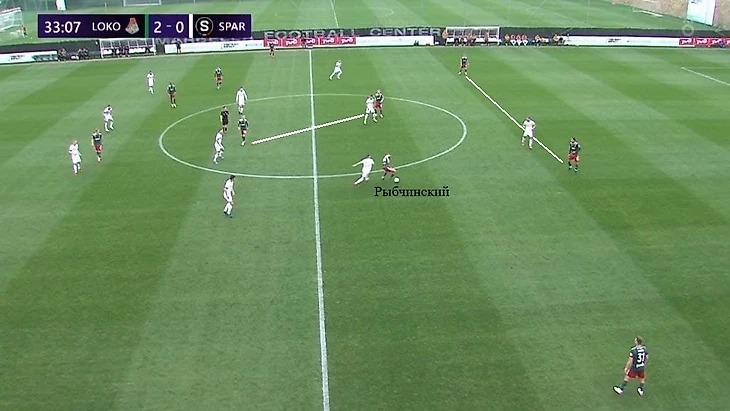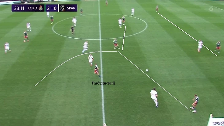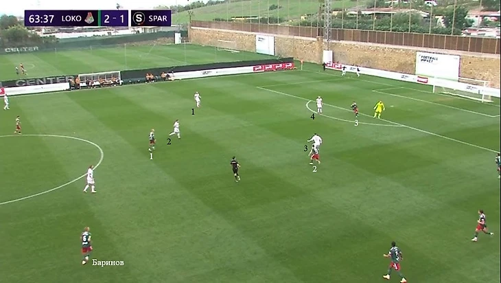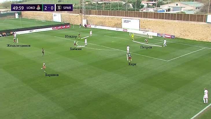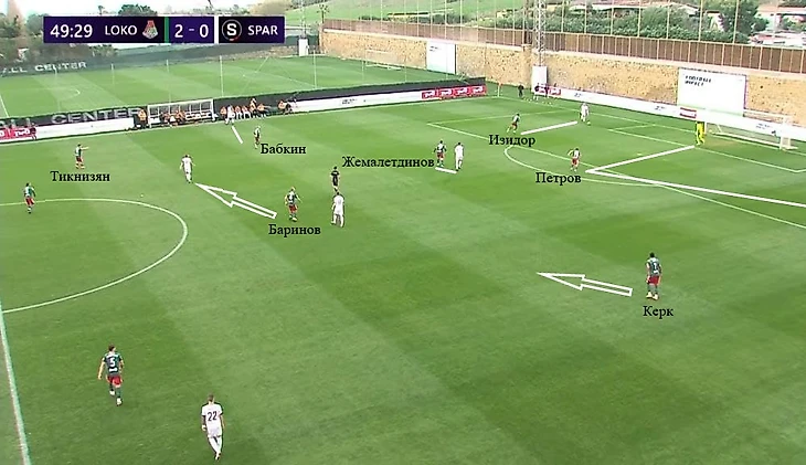 Через 20 секунд случился почти идентичный эпизод. Изидор снова располагался по центральному защитнику правее, Петров же оказывал давление на игрока с мячом и затем до конца напрягал вратаря. Керк играл по левой восьмерке, Бабкин – по опорнику, Жемалетдинов – по правому защитнику. Баринов страховал всю структуру, а Пабло встретил правую восьмерку соперника после длинного паса вратаря. «Локомотив» смог забрать владение и начать новую атаку.