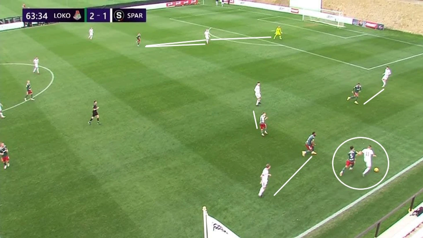 На 64-й минуте Константин Марадишвили вынудил крайнего полузащитника отдать на вратаря, его встретил Жемалетдинов, но «Спарта» все-таки смогла сохранить владение. Петров, Бабкин и Жемалетдинов оказались в численном меньшинстве в конкретной зоне (Баринов находился ниже и не успевал помочь) и не смогли отобрать мяч.