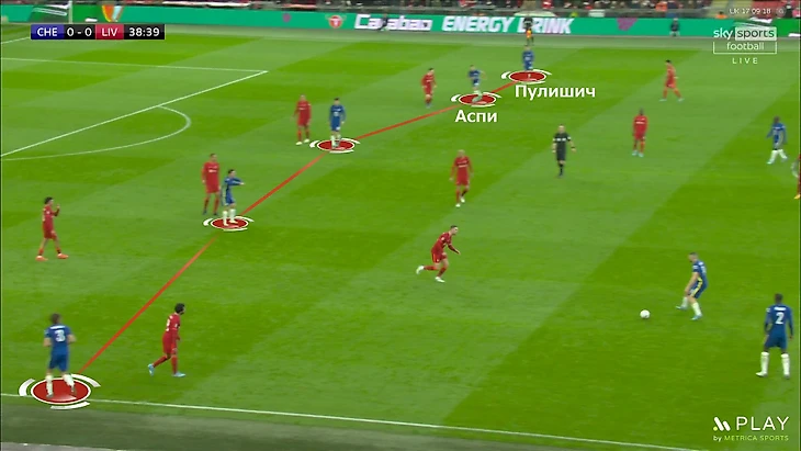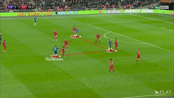 Тут Пулишич опустился в зону десятки, а Хавертц и Маунт открываются (один для потенциальной комбинации, другой – за спину):