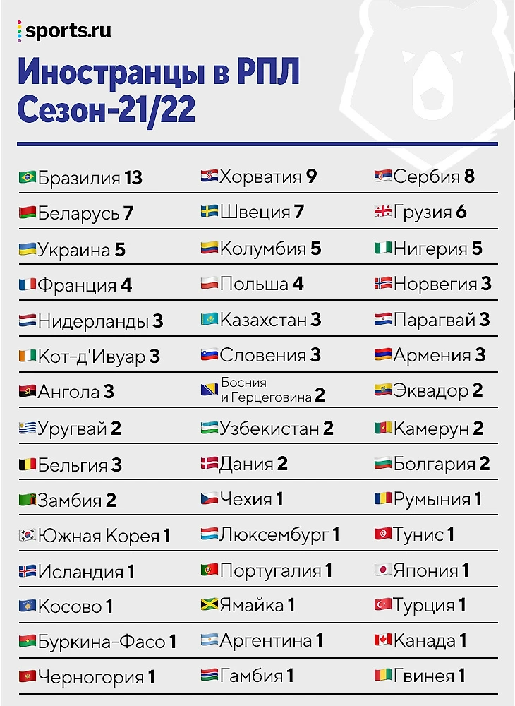 26 февраля РПЛ вернулась после зимнего перерыва. К возобновлению чемпионата мы посчитали всех легионеров в лиге. К весенной части чемпионата подошли представители 45 стран.