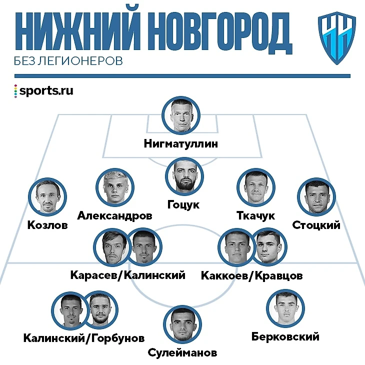 На первый матч весны «Нижний Новгород» вышел с русскими вратарем и пятеркой защитников. В центре поля – ключевой игрок первой части сезона Николай Калинский плюс кто-то из тройки Никита Каккоев, Павел Карасев, Кирилл Кравцов.