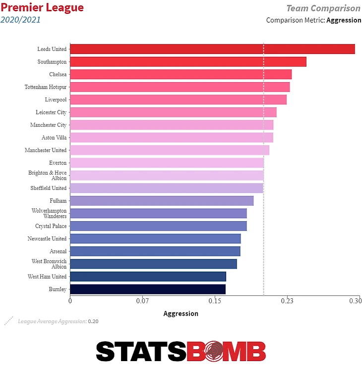 Давление «Лидса» в прошлом сезоне было самым интенсивным в АПЛ (что пошло не так в этом, разберем ниже). У Statsbomb тоже есть метрика, которая передает смелость прессинга «Лидса» (граничащую с суицидальной). Агрессивность – пропорция передач соперника, за которыми следовало прессинг-действие, фолы или попытка отбора. То есть каждый третий пас соперника «Лидс» встречал таким образом: