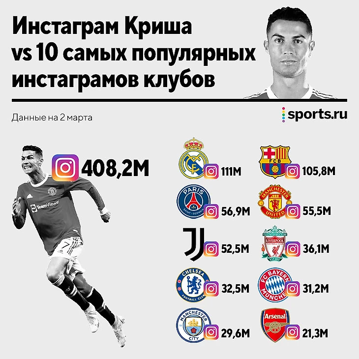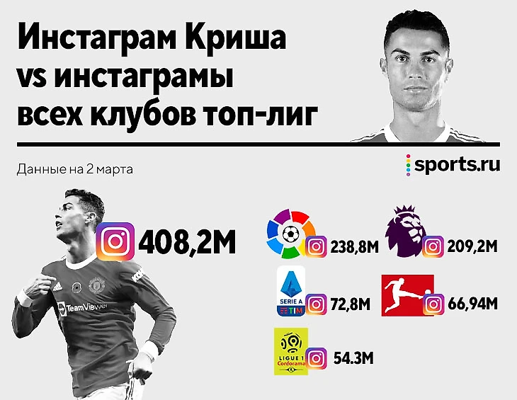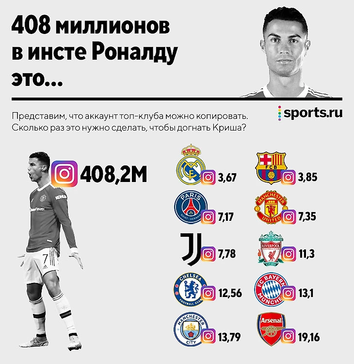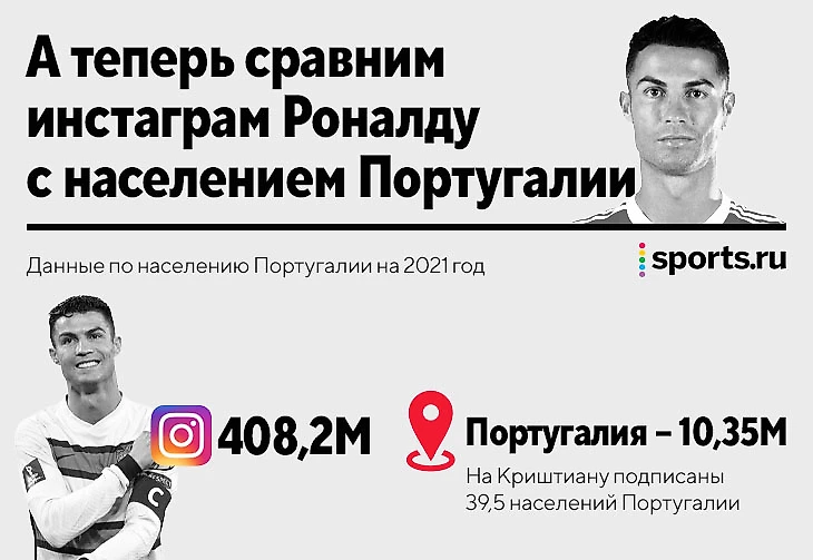 Ровно месяц назад Криштиану Роналду укрепился в статусе самого популярного человека в инстаграме – аккаунт форварда пробил отметку в 400 млн подписчиков. Чтобы понять масштаб медийного величия Криштиану, мы сделали несколько сравнений – с другими селебрити, клубами, лигами и даже странами.