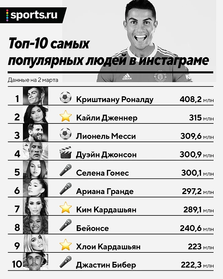В десятке самых популярных людей в инстаграме Криштиану идет с гигантским отрывом от второго места. Спортсменов в топе всего два – Роналду и Месси.