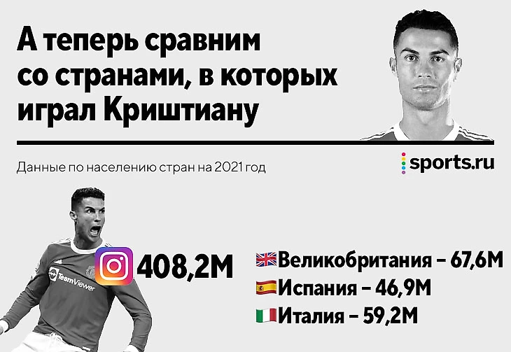 На инсту Роналду подписано 408 млн человек – насколько это много? Сравнили с другими звездами, клубами и даже странами